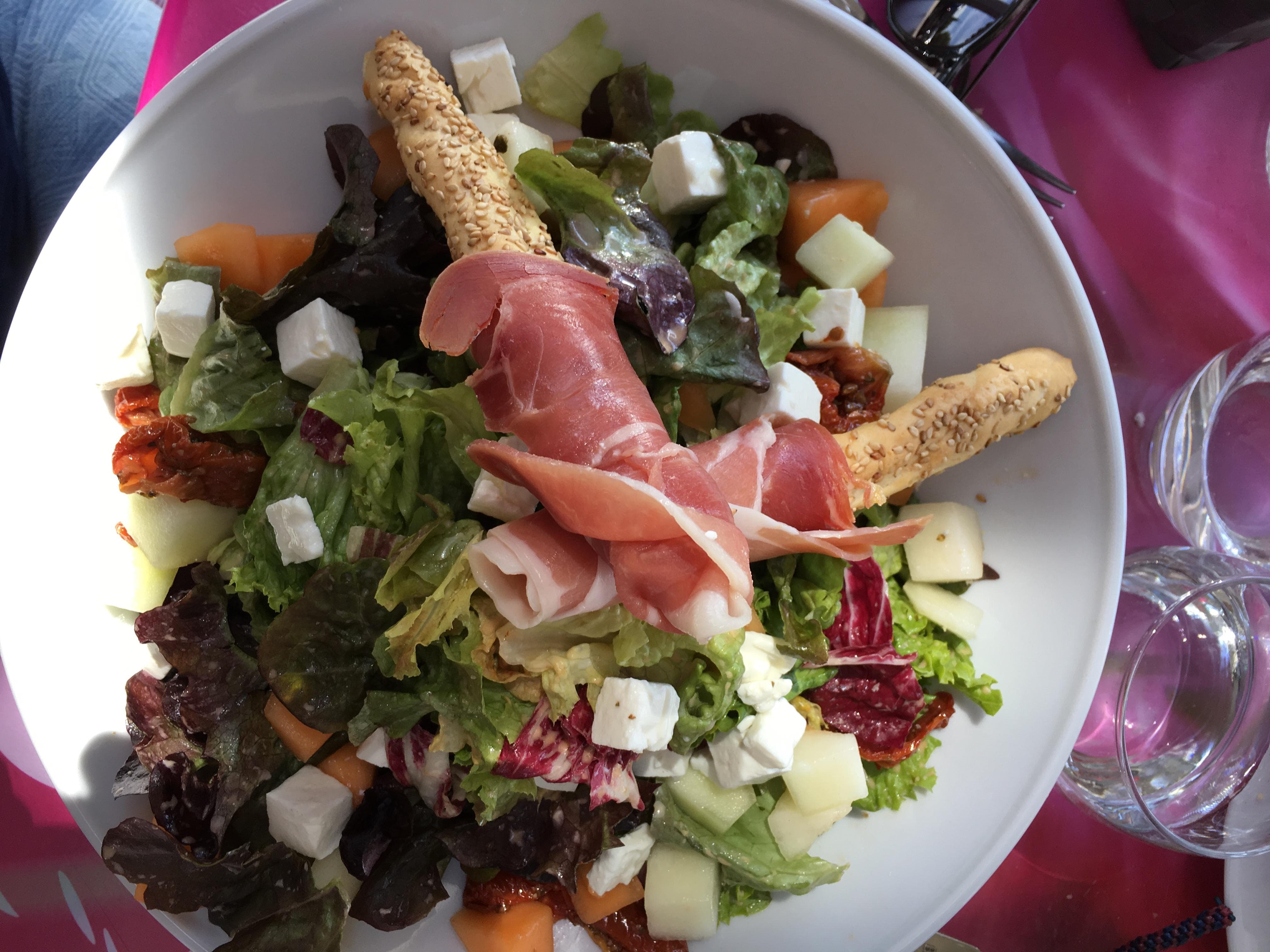 Nos plats sont vite servis, et a ma grande surprise ils sont très copieux! D’habitude, je crains toujours en choisissant une salade, j’ai peur de rester sur ma faim. Mais regardez ça :