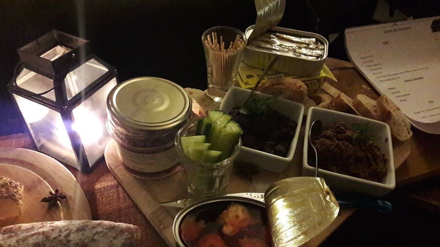 Et à part le poulpe qui est fadasse, ils sont tous bons. Mention spéciale pour la tapenade noire qui a beaucoup de goût et les sardines délicates – d’habitude ça m’écoeure ces machins plein d’arêtes mais là y’avait pas d’arêtes (et j’ai quasi tout bouffé à moi seule aheeeem).